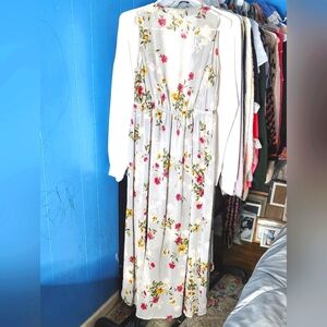 Elegant sleeveless Kimono with a floral pattern featuring colors of pink, yellow, and green on a gray background. Has a string tie at the waist to tighten. Perfect for a breezy, stylish look this spring and summer! New, never worn! One size- fits small-large.