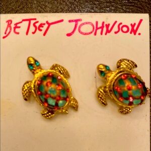These whimsical turtle-shaped earrings by Betsey Johnson feature a vibrant green enamel inlay, beautifully contrasted with intricate gold-toned detailing. The playful design captures attention with its unique blend of colors and textures, making it a standout accessory for any occasion.