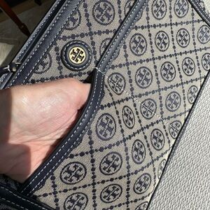 Tory Burch T Monogram Jacquard Travel Pouch Navy and cream, leather trimmed