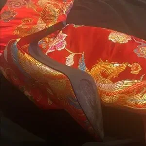 These striking heeled boots feature a vibrant red base adorned with intricate golden designs, creating a luxurious and opulent look. Made from a glossy material, they boast a high stiletto heel that adds drama and elegance to any ensemble. The ornate patterns evoke a sense of sophistication and style, perfect for making a bold fashion statement.