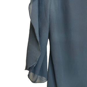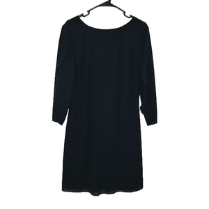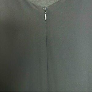 Women’s black flowy dress. Dress has slits in the arms and a zipper on the back. Material is 98% polyester and 2% viscose. Fabric has no stretch to it.