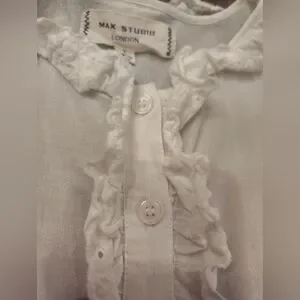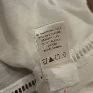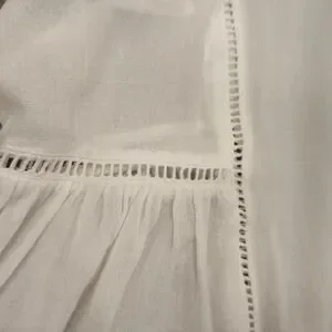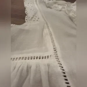 Summery white sleeveless blouse with eyelet details. Cute and classy. Front buttons. Wear for a casual or dressy look.