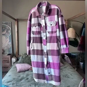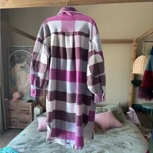 Excellent like new condition, this is the perfect addition to your winter wardrobe. Purple, brown and blue plaid with a patchwork, elbow, oversized, and perfect for layering size small