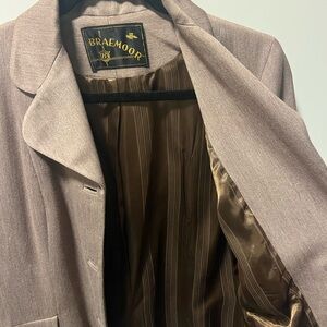 Timeless and elegant, this vintage Braemoor blazer features structured tailoring, wide notched lapels, and a warm taupe-brown tone.