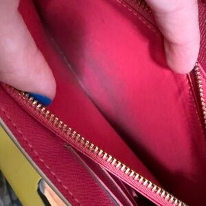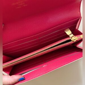 Elevate your style with this Louis Vuitton checkered wallet. Featuring a chic beige and pink design, this accessory is perfect for any occasion. Crafted with precision and elegance, it's a must-have for fashion enthusiasts. Authentic Louis Vuitton Damier Azur Studded Sarah Wallet. In good condition, see photos for closer look.