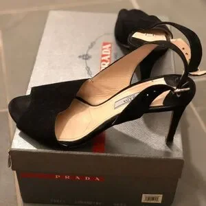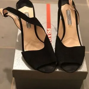 Prada Timeless Black Suede Open Toe Heels 7.5
