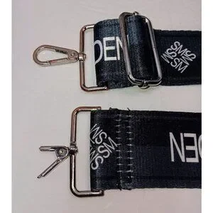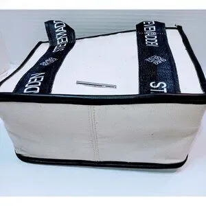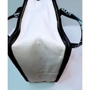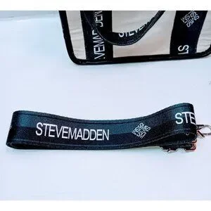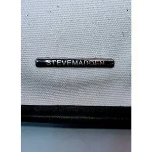 Steve Madden Bwebber Convertible Blue/Beige Tote Bag. Cotton Faux Leather Or Faux Patent Leather With A Canvas Strap And Branded Hardware Accents, Magnetic Snap Closure, One Slip Pocket and Dual Top Carry Handles. One Of The Clips On Strap Is Broke. Use Good Preowned Condition