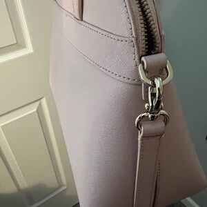 This elegant Kate Spade satchel in a soft pink hue features a structured design with a charming bow detail. Crafted for versatility, it includes both top handles and a detachable shoulder strap, making it perfect for everyday use.