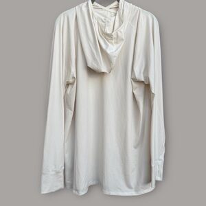 Long-sleeve active top with hood from the North Face, womens size XXL. Good used condition. The material is a stretchy and lightweight. The sleeves have thumb holes.