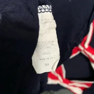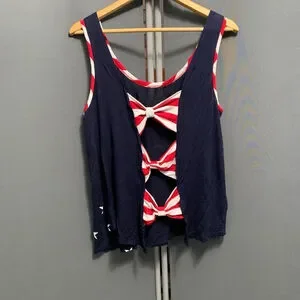 This is a pre-owned tank top, size M, made in USA. The garment features a navy blue base adorned with white star patterns. The neckline and arm openings are trimmed with red and white striped fabric. The back has three decorative bows. The material composition is rayon and spandex. There are no visible stains or tears, but the fabric shows slight signs of wear.