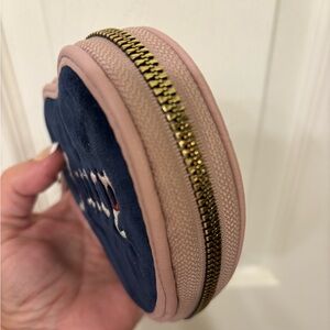 Juicy Couture wristlet in dusty pink faux leather with dark blue velvet front. Embroidered Juicy logo. Zips around for easy access. About 5x5”