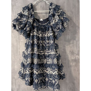 This is a new with tags "Sofie the Label" dress. The dress is a size small and features a navy blue and white paisley pattern. It has a square neckline with elastic gathering and short, ruffled sleeves. The dress is tiered with lace trim. The dress is new with tags