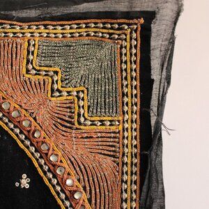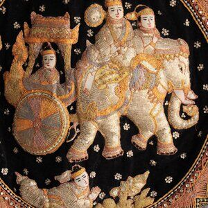 Gorgeous vintage wall hanging from Burma (Myanmar) called a Kalaga. Features people riding in a cart drawn by an elephant. Possibly a scene depicting Buddha or King Rama. This particular Kalaga is quite ornate, utterly dripping in sequins and beads. The main characters are raised from the black velvet backing fabric with some sort of stuffing. Can be hung with curtain clips. Would be a lovely framed too. Quite a large one. Measures approx. 26" square. It was purchased by the original owner in the 1940s. It may be ( and probably is) older. Excellent vintage condition, a few missing stones and bead from the circle of these, and some stitches that attach it to the back black muslin are loose. That's all I could find worth noting. This is a very special piece.