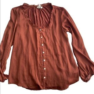 Anthropologie; Dolan Marilyn Button Down Blouse has a scoop neck with ruffle lining. It has a polyester light knit like back panel.