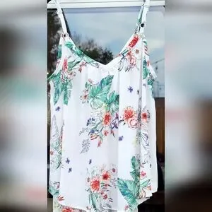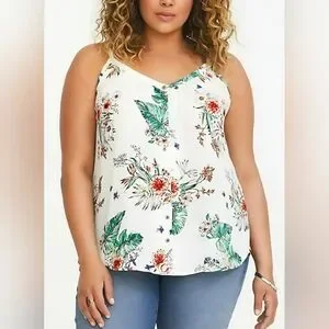 This gorgeous Torrid multi-color floral cami is perfect for warm weather or layering under a cardigan for a chic, effortless look. Featuring a beautiful white base with a vibrant tropical floral print, this top is both feminine and stylish. The button-front detail adds a touch of elegance, while the adjustable spaghetti straps ensure a customizable fit.