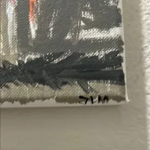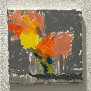 Vibrant abstract floral painting on canvas. Features bold orange, yellow, and gray tones.