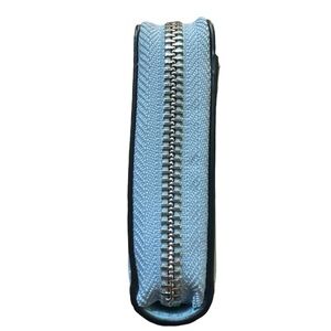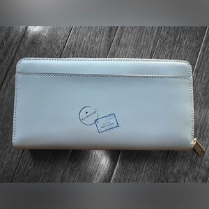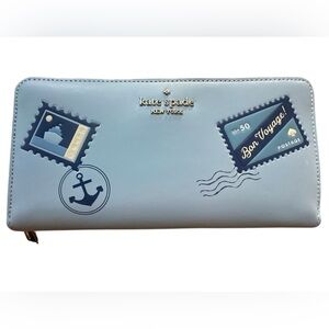 Stylish blue wallet with travel-themed designs. Features iconic Kate Spade logo.