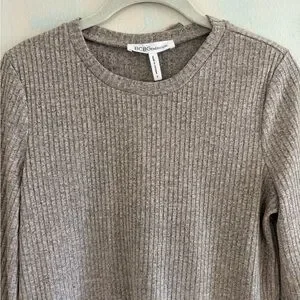 Gorgeous marled space dye dusty pink tan sweater shirt, ribbed knit layered over a button down shirt for a pop of peplum coming from underneath. Sleeves have a slight bell to them. Crewneck