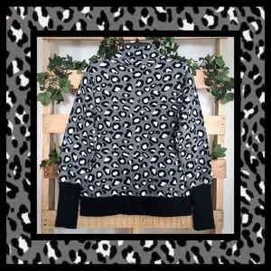 Rachel Zoe’s leopard print sweater features a black and white on gray animal print pattern with black extended cuffs and a black waistband, mock neck, 2 outside pockets and center zip closure. Made of heavy knitted material, this sweater is sure to keep you stylish and warm. Great for Fall and Winter seasons.