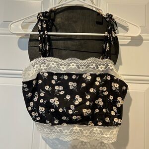 Chic black crop top with floral print and lace trim. Perfect for casual outings.