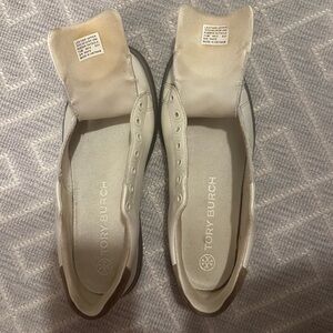 In good used condition. Leather upper with rubber sole. There is some scuffing on the toes, see photos. They still have tons of life left! Size 7.5 The color is an off white, with brown suede on the back. Shoestrings are in the wash.