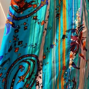 Photos don’t do the colors of this dress justice! Vintage midi dress in size medium with short kimono sleeves and tie at waist with deep v-neck. No condition issues or signs of wear.