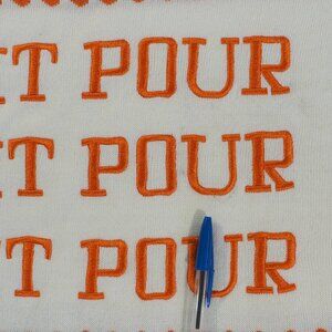This sweater is in good preowned condition. There are light marks on the front, middle "POUR", photos 4 and 5.