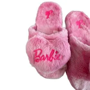 Live your ultimate Barbie fantasy with these adorable slippers. Featuring a fluffy pink heart with an embroidered logo and a non-slip sole.