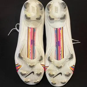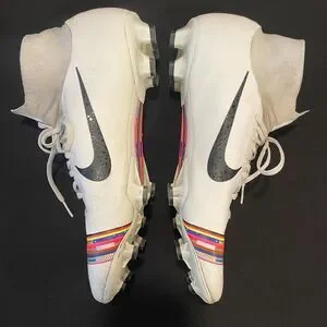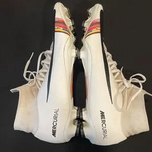 This cleat comes with Flyknit construction, giving it the lightweight feel players need. Everything about its design is tuned for speed. This level of cleat is made to hug your foot, giving you more support. Mercurials are and have been one of the best cleats in the game for more than 25 years. A reliable, quality cleat that is perfect for speed and power. Made for use on artificial grass / artificial turf. GUC: Good, pre-owned condition. Some wear/stains, as shown. Have not tried to treat the sock area stains. Plenty of life left in these high quality boots!