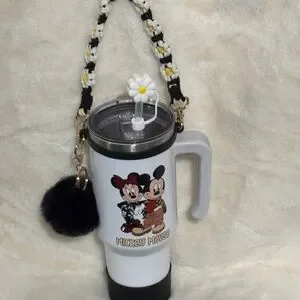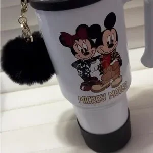 White travel mug featuring Mickey Mouse design. Includes a black pom-pom keychain.Hand wash only. NWOT