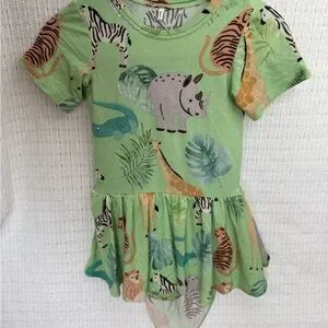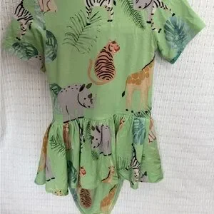 Like new. Worn once, no stains or tears. Runs small. Adorable green dress with animal prints. Features rhinos, zebras, and tigers. Perfect for playful days.