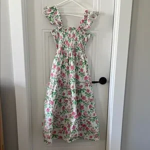Charming preowned dress in great condition featuring a delightful floral pattern in pink and green. Perfect for any occasion. It has a smocked top and hidden side seam pockets.