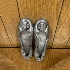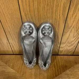 Stylish metallic ballet flats with iconic Tory Burch logo. Perfect for any occasion.