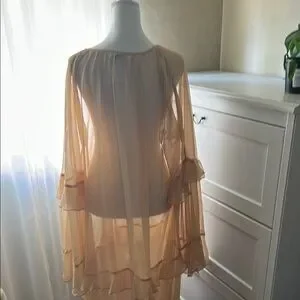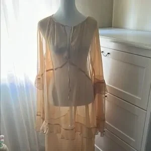 Elegant sheer tan maxi boho chic maxi dress with ruffle details. Perfect for layering. A size Medium.