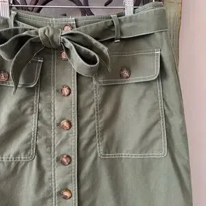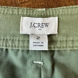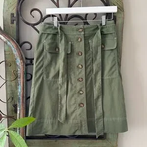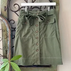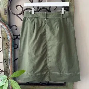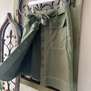 NWOT J. CREW Linen Blend A-Line Skirt, Women’s size 2, color Olive Green. This super cute skirt is lined including button down and belted detail, contrasting white trim, in excellent new condition, never worn. See photos for specific details.