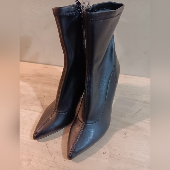 A stretchy shaft embodies contemporary style on a striking bootie framed by a pointy toe and translucent wedge heel.