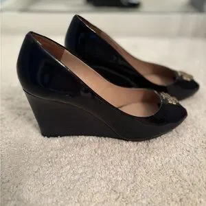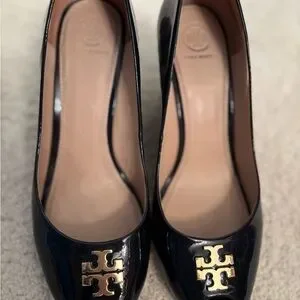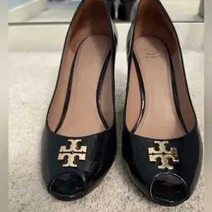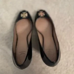 Elegant Tory Burch peep-toe flats in classic black. Perfect for any occasion.
