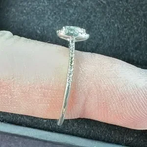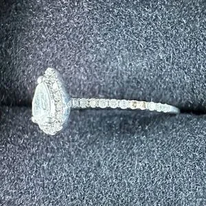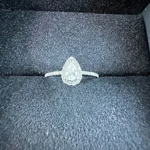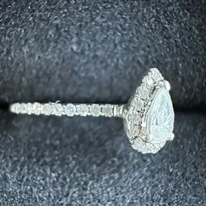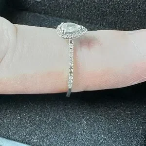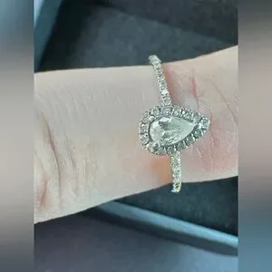 This beautiful, dainty, very dainty diamond ring showcases a pear cut diamond center stone surrounded by a halo of small diamonds with diamonds adorning the band. This ring is set in 10K white gold. It is very small and dainty. US size 5.5- 6. It’s is a very dainty ring. Center stone is .25 ct. surrounding stones make up another .25 ct.