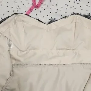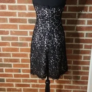 previously worn strapless black lace dress by white house black market, size 4. rubber at the top to prevent slipping, back zipper, no pockets.