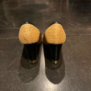 -“Beige/Blue Raffia And Patent Leather Round Toe Pump (Size 9 1/2 M)