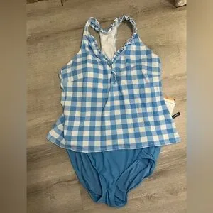 Beach House 2pc swimsuit NWT high waisted bottom size 16W and Top is a size 18W but fits like a 16W as the top runs a little smaller. Color is actually truer to the stock photo, my camera makes it look darker than it is.