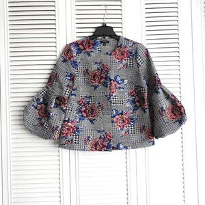 Elegant Alfani spring/summer blazer/jacket with houndstooth patchwork pattern, large roses, and gold metallic thread details. Business casual, office, cocktail. Large snap buttons, no pockets. Size S. Excellent condition.