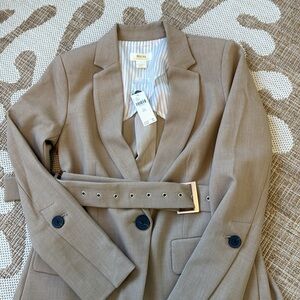 Elevate your style with this chic tan blazer, featuring a sleek belt for a tailored fit. Perfect for both professional and casual settings. The back is longer than the front with pleated detailing. Silver hardware. A beautiful jacket . Runs slightly large.