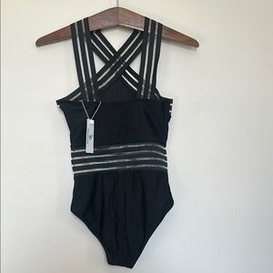 Elegant black swimsuit featuring silver stripe details and a criss-cross strap halter top design.