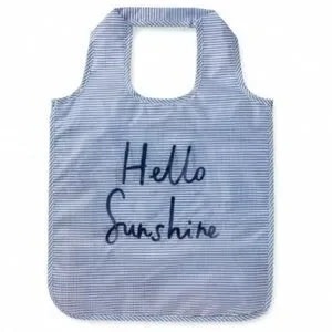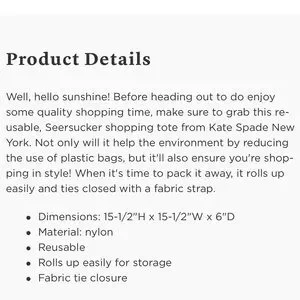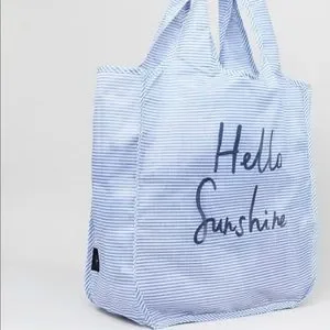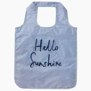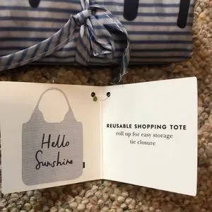 💯% authentic Kate Spade ♠️ Hello Sunshine Reusable Shopping Tote NWT shop with style seersucker pattern nylon tote with Hello Sunshine detail fabric tie closure rolls up for easy grab and go colors are blue and white never been used