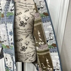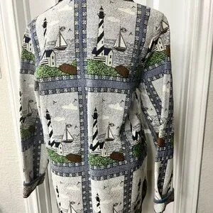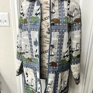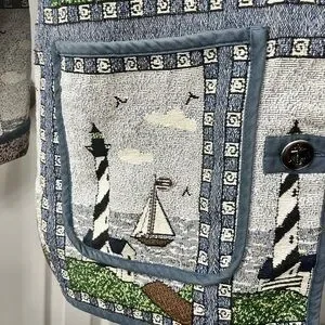 Charming vintage Blair lighthouse jacket with nautical print. Features sailboats and lighthouses. Blue trim and buttons. Beautiful tapestry. Perfect for the vintage lover!