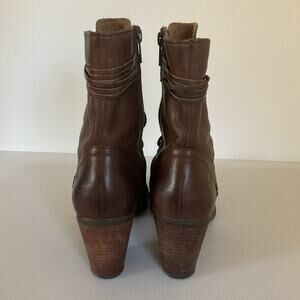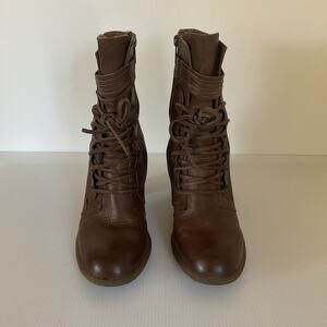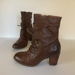 • Stylish brown leather ankle boots with lace-up front and side zipper for easy wear.