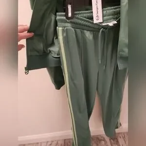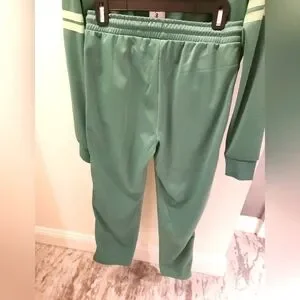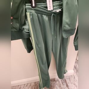 Trending S/S 2025 stylish green track suit with stripe details. Perfect for casual wear, pants can also be worn with a cotton lace top shown in weworewhat.