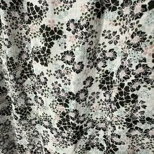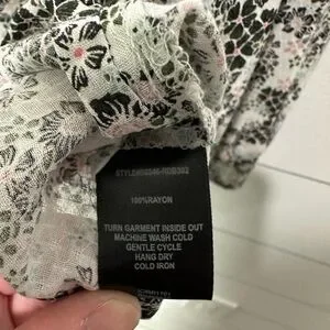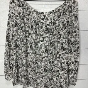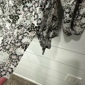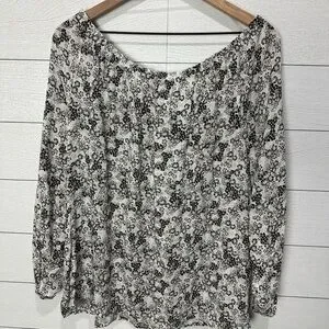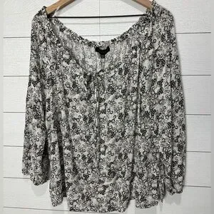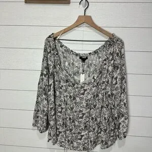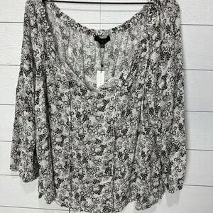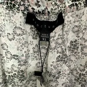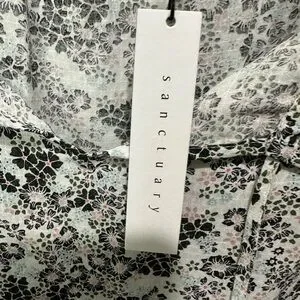 NWT Sanctuary Blouse Size XL. Black and white with pink and blue small floral, adjustable shoulders, elastic at neck and cuffs, tie at neckline, slits on sides. Measures approx 22” pit to pit and 25.5” length.
