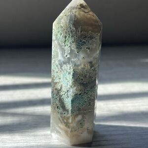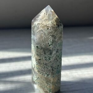 Beautiful moss agate crystal tower with natural green and cream patterns. Perfect for decor or meditation.